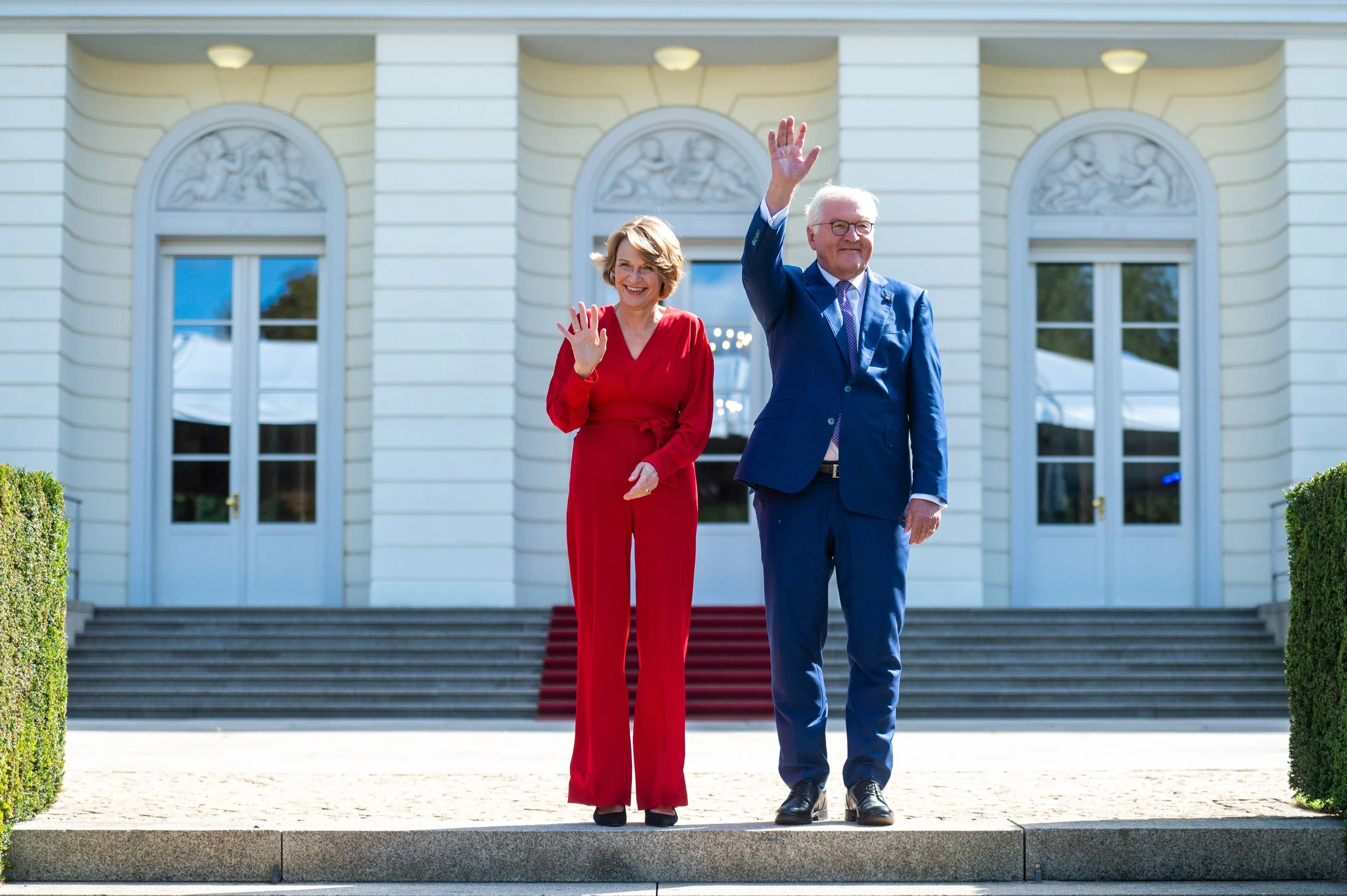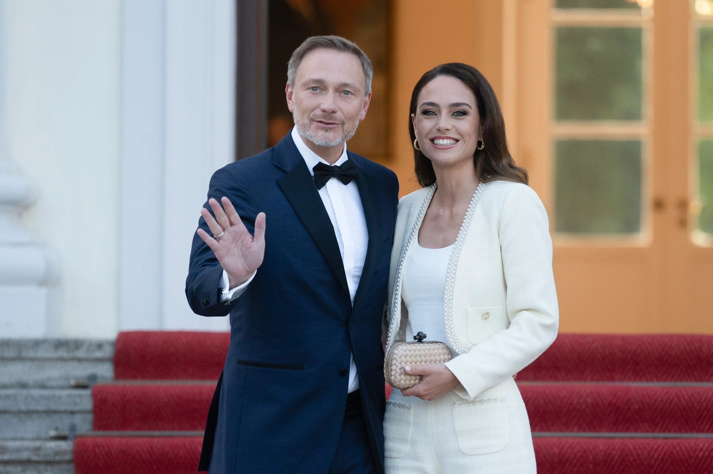 Christian Lindner, Bundesminister der Finanzen, und seine Frau Franca Lehfeldt vor dem Schloss Bellevue.