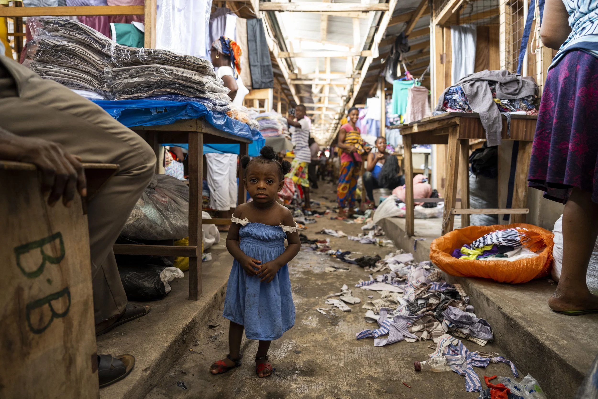 Ein kleines Kind steht auf einem Markt an einem Bahnhof in Accra, Ghana auf dem unter anderem Kleidung aus Europa verkauft oder weiterverarbeitet wird