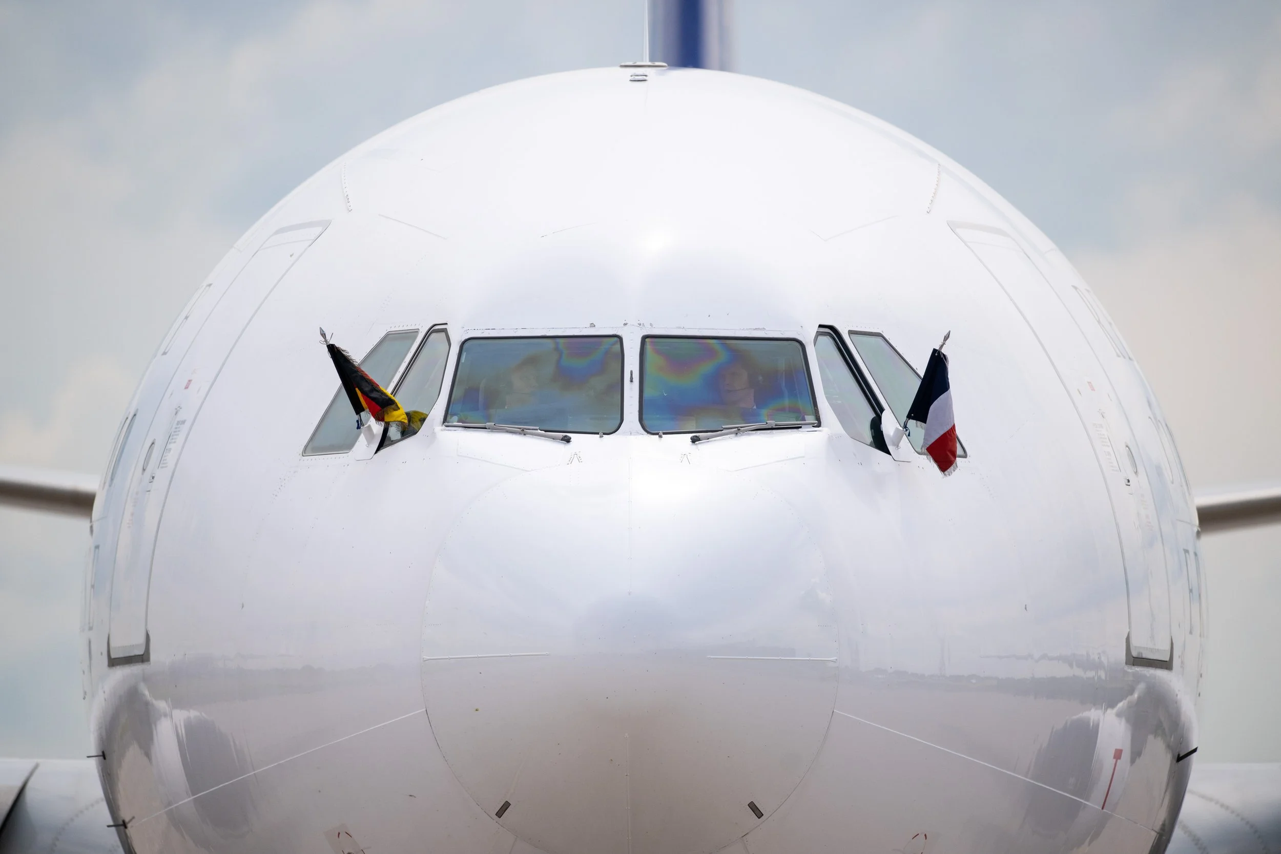 An dem Flugzeug von Emmanuel Macron sind bei einem Besuch eine Deutsche und eine Französische Flagge.
