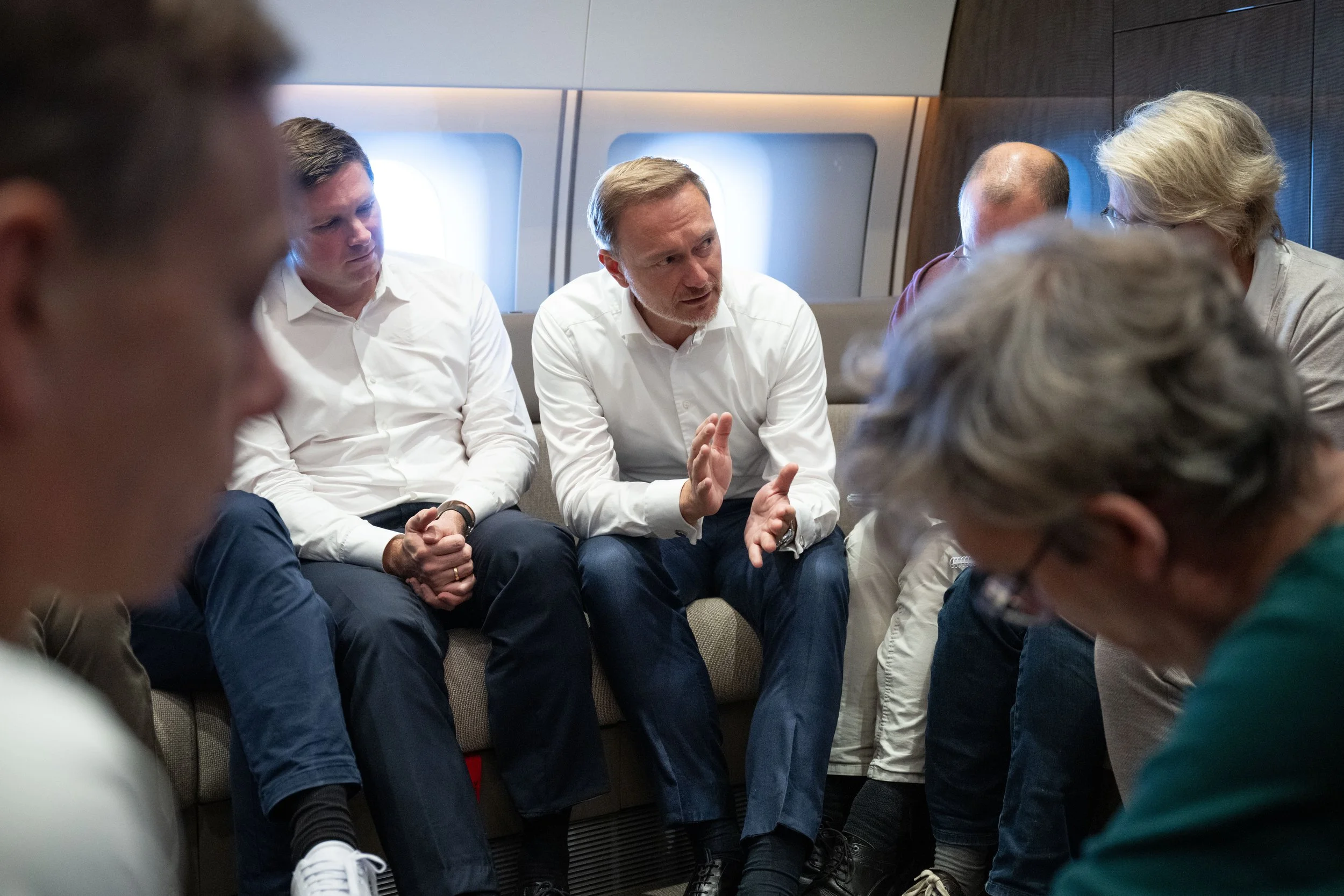 Finanzminister Christian Lindner im Flugzeug nach Marrakesch bei einem Hintergrundgespräch mit Journalisten