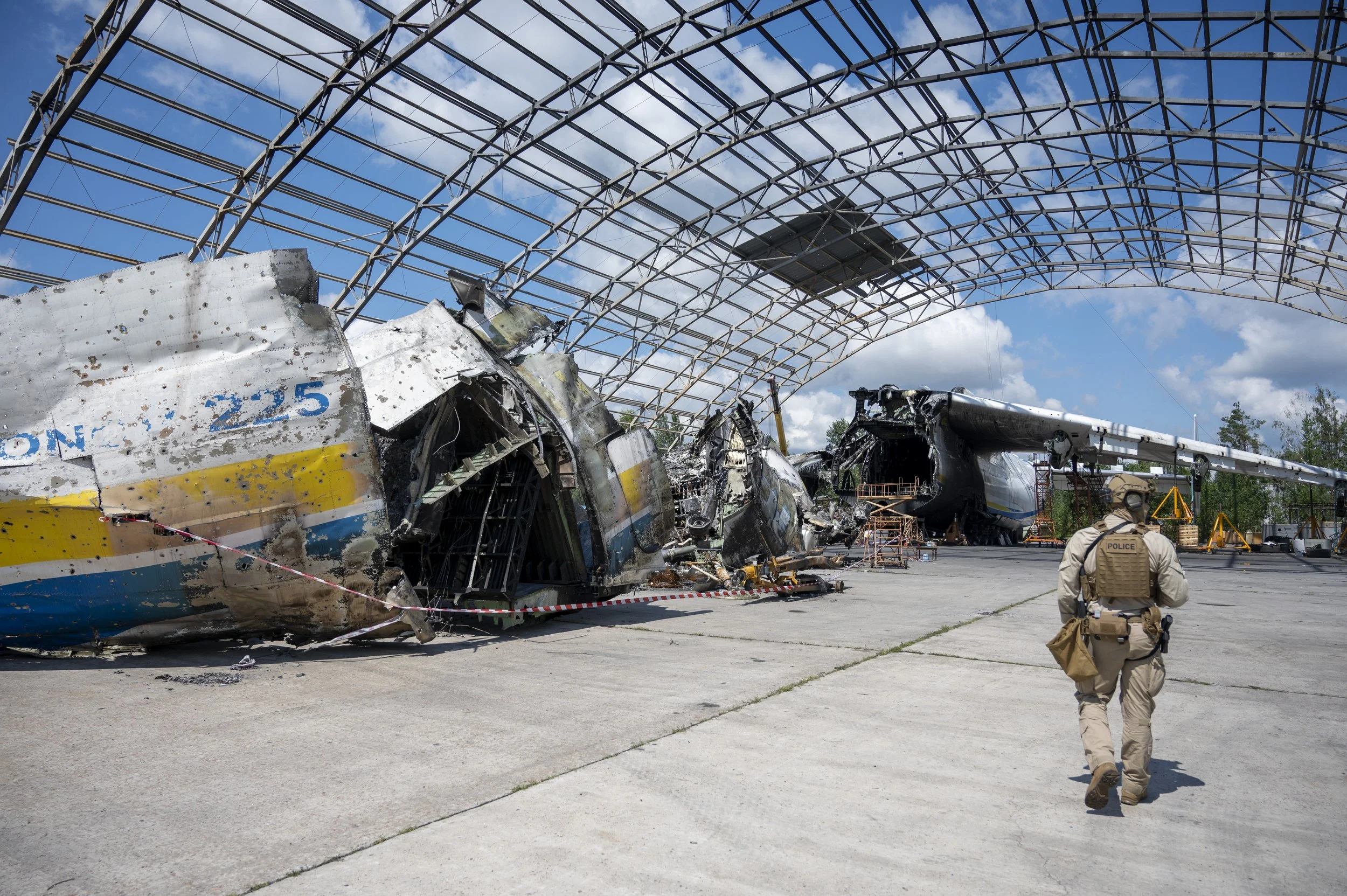 Von den Russen zerstörtes Antonov Flugzeug in Hostomel, Ukraine
