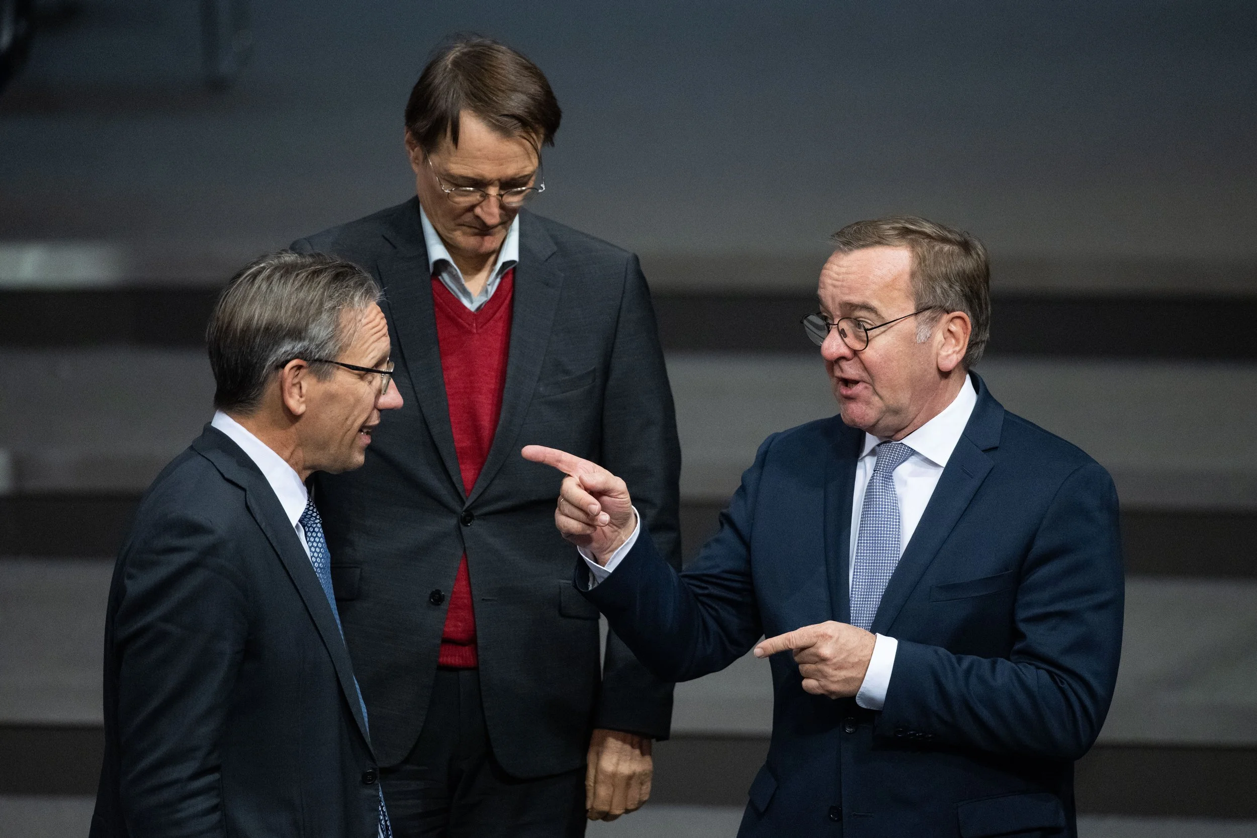 Jörg Kukies (SPD), neuer Bundesminister der Finanzen, im Bundestag mit Karl Lauterbach , Bundesminister für Gesundheit, und Boris Pistorius, Bundesminister für Verteidigung.