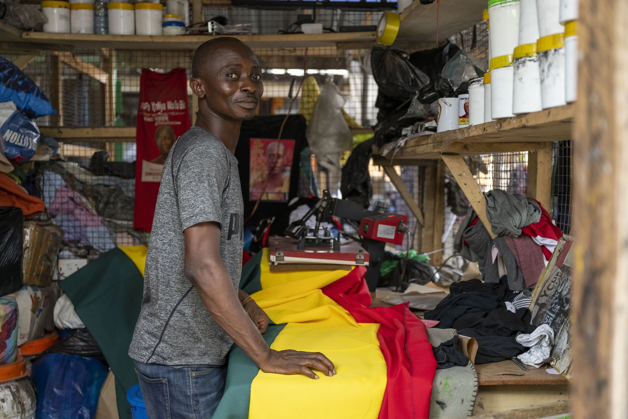 Ein Mann arbeitet auf einem Markt an einem Bahnhof in Accra auf dem unter anderem Kleidung aus Europa verkauft oder weiterverarbeitet wird und näht eine Ghanaische Flagge.