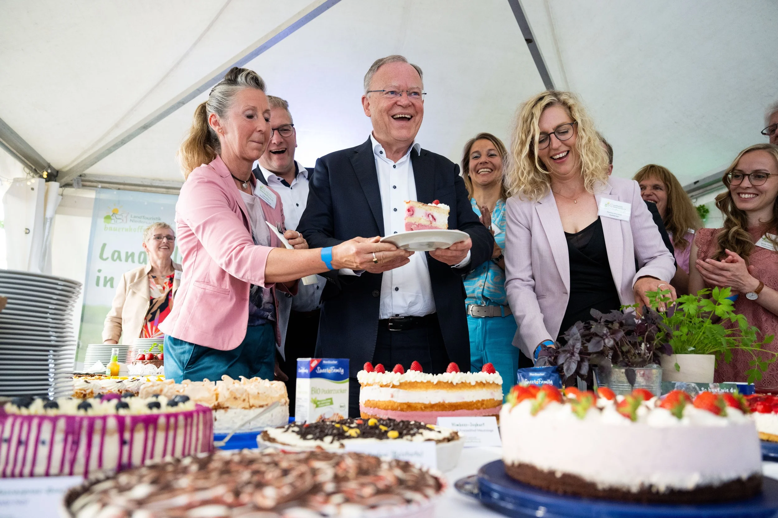Stephan Weil, Ministerpräsident von Niedersachsen, besucht beim Sommerfest der Landesvertretung Niedersachsen einen Stand und bekommt ein Stück Torte.
